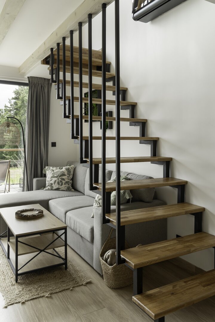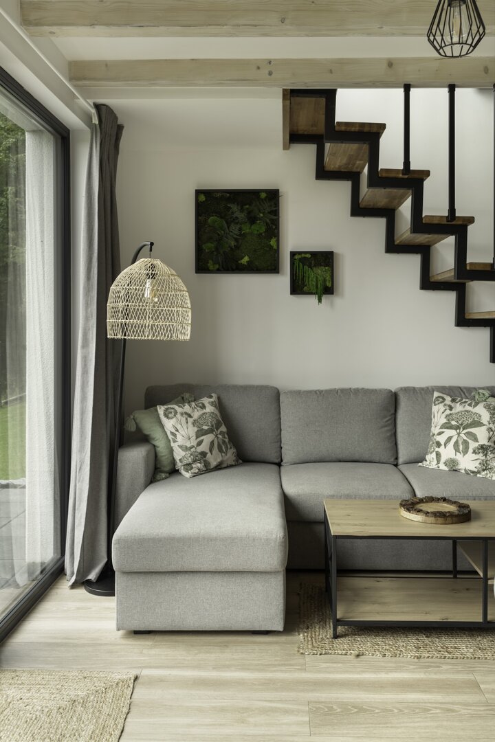 Dodatkowe miejsca do spania znajdują się w salonie, gdzie umieściliśmy rozkładany, dwuosobowy narożnik. Na piętrze, oprócz głównej sypialni, jest także wygodna sofa, która może służyć jako dodatkowe łóżko. Dzięki temu nasz domek jest w stanie komfortowo pomieścić do ośmiu osób, zapewniając każdemu gościowi wygodne miejsce do spania.